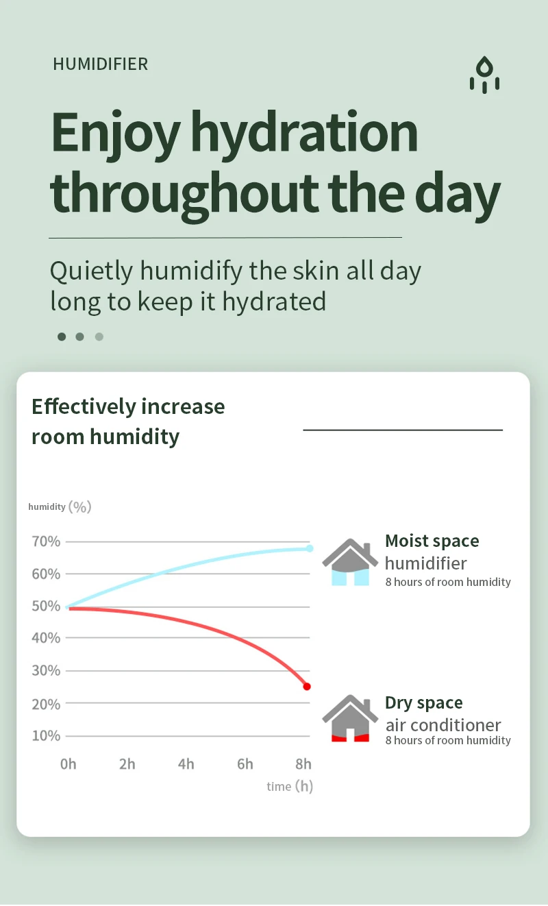 USB Humidifier: 100-150ml/h spray volume, 8 hours timer, auto shut off to preventing buring without water.